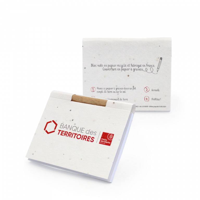 Design et conception vous présentent le bloc-notes papier graines avec son mini crayon. C’est une solution à la fois ingénieuse et charmante pour montrer votre engagement auprès de vos clients pour un avenir plus vert tout en favorisant la biodiversité. Ce bloc-notes est un outil pratique pour les notes quotidiennes. En effet, la couverture en papier ensemencé invite à planter plutôt qu’à jeter, transformant le cadeau en un geste de soutien à la biodiversité grâce aux variétés de graines. C’est 100 % Français avec un souci méticuleux de la qualité. Chaque bloc-notes de 100x85x7 mm contient 50 feuillets repositionnables pour des forêts gérées durablement. Sa couverture, faite à partir de papier à graines de fleurs mellifères n’attend qu’à être personnalisée. Il est un porte-parole de la marque de votre client, facilitant la distribution et la communication de valeurs positives.