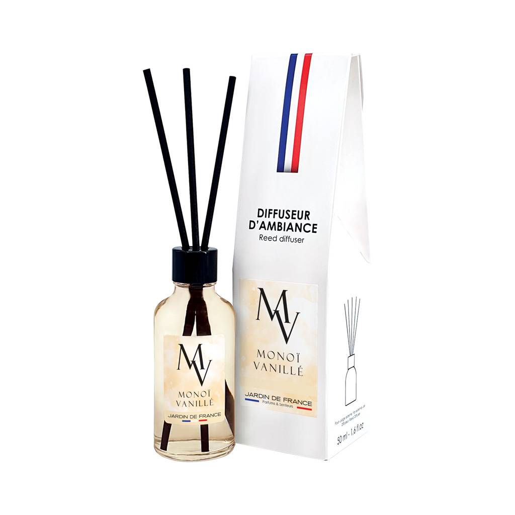 Design et conception vous présentent le diffuseur de parfum, chaque vaporisation dévoile la douceur du monoï et la chaleur réconfortante de la vanille, transformant votre espace en une île tropicale de bien-être. Son utilisation est simple retirez le bouchon du flacon. Insérez les bâtonnets dans le flacon. Attendez quelques heures pour que les roseaux absorbent le parfum. Placez le diffuseur dans un endroit sec, stable et hors de portée des enfants et des animaux. Idéal pour donner une bonne ambiance et ce sentir bien. Sélection de diffuseur fabriquer en France par une marque Française. Soutenir les producteurs locaux est important.